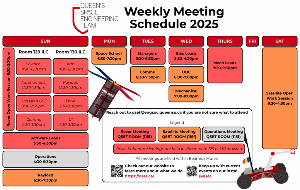 QSET consists of two teams that operate independently on various technical projects: the Rover Team and the Satellite Team. Members can take on a variety of projects covering a variety of skill levels, but no experience is required to join. The only requirement to join is an interest in space and engineering design. Our goal is to provide an environment where students can develop industry transferrable skills through hands-on experience!